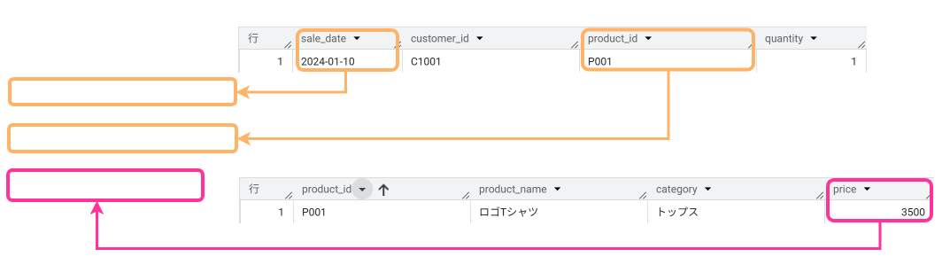そこで、金額(price)情報を持つ商品テーブル(products)を、売上テーブル(sales)に結合し、1つのテーブルにまとめてしまいます。
