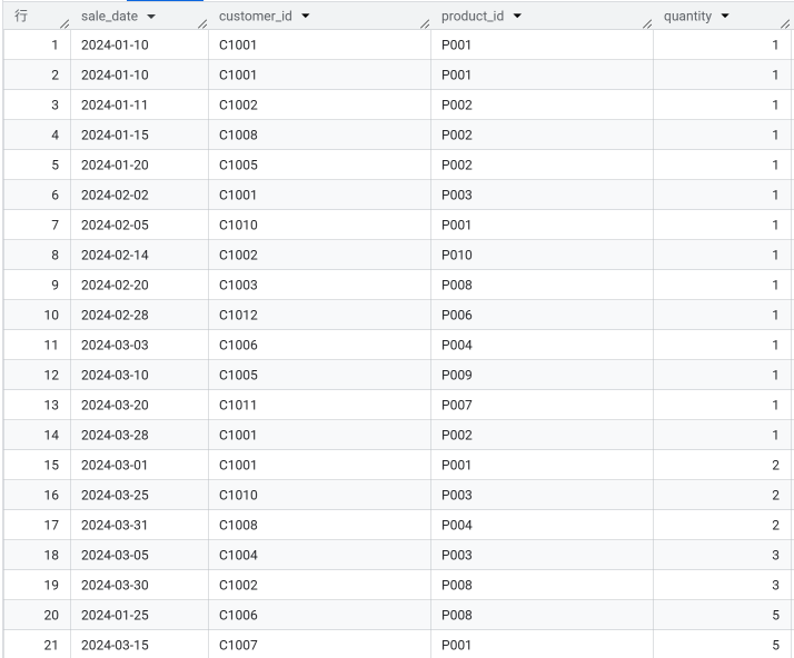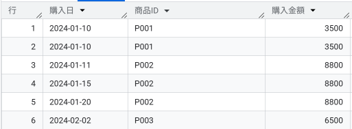 ①:FROMで指定した売上データ(sales)を取得(一部抜粋)