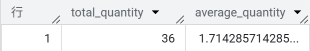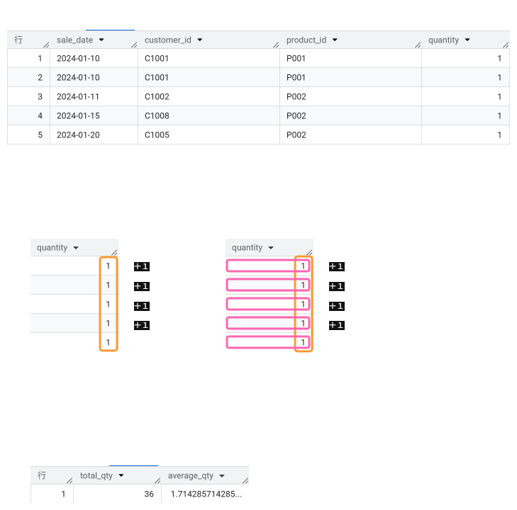 この実行結果は、売上テーブルにある全行の数量をすべて足し合わせると「36個」になり、1行あたりの平均は約「1.7個」であることを示しています。